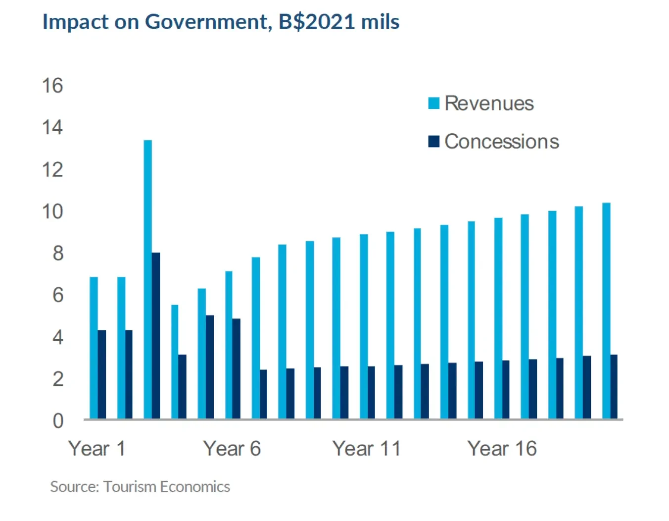 Compares government revenues and concessions, highlighting the projected financial gains exceeding granted incentives.