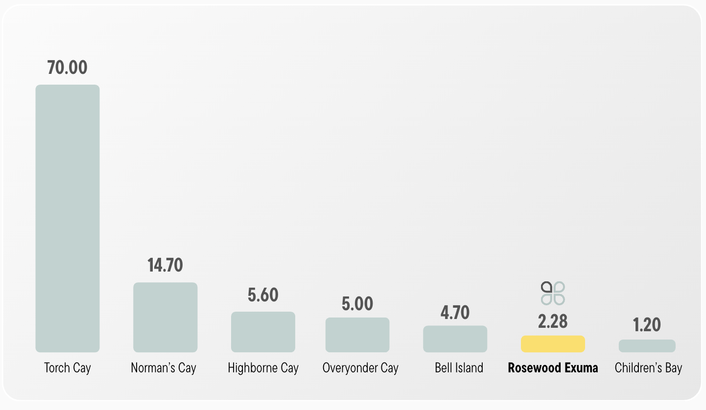 Rosewood Exuma’s marine components have been designed to minimize environmental disturbance. When compared with established Family Island developments, the project’s dredging footprint remains among the smallest. This reflects a design philosophy centered on responsible